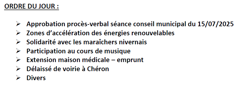 La prochaine réunion du conseil municipal aura lieu mardi 30 septembre 2025 à 20h30 à la mairie, salle des cérémonies.